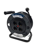 Enrollacables eléctrico con 4 enchufes Schuko de 25m de longitud. Estructura robusta y mango ergonómico. Asa de rebobinado extensible. Interruptor de alimentación. Guía de cable integrada. Desconexión térmica. Alta visibilidad. Indicador LED.