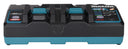 Cargador rápido de dos puertos que es capaz de cargar dos baterías Makita XGT Li-Ion a la vez tan rápido como el DC40RA carga una batería, Carga una batería en 22 - 50 minutos, dependiendo de la capacidad de la batería.