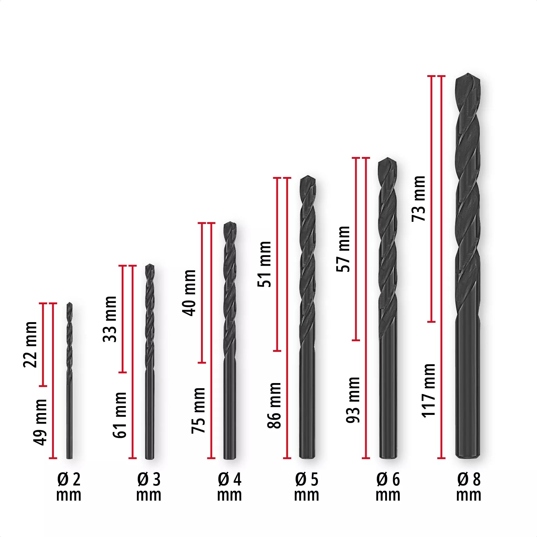 • 6 brocas para metal HSS-R con diámetros de 2 mm, 3 mm, 4 mm, 5 mm, 6 mm y 8 mm.