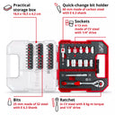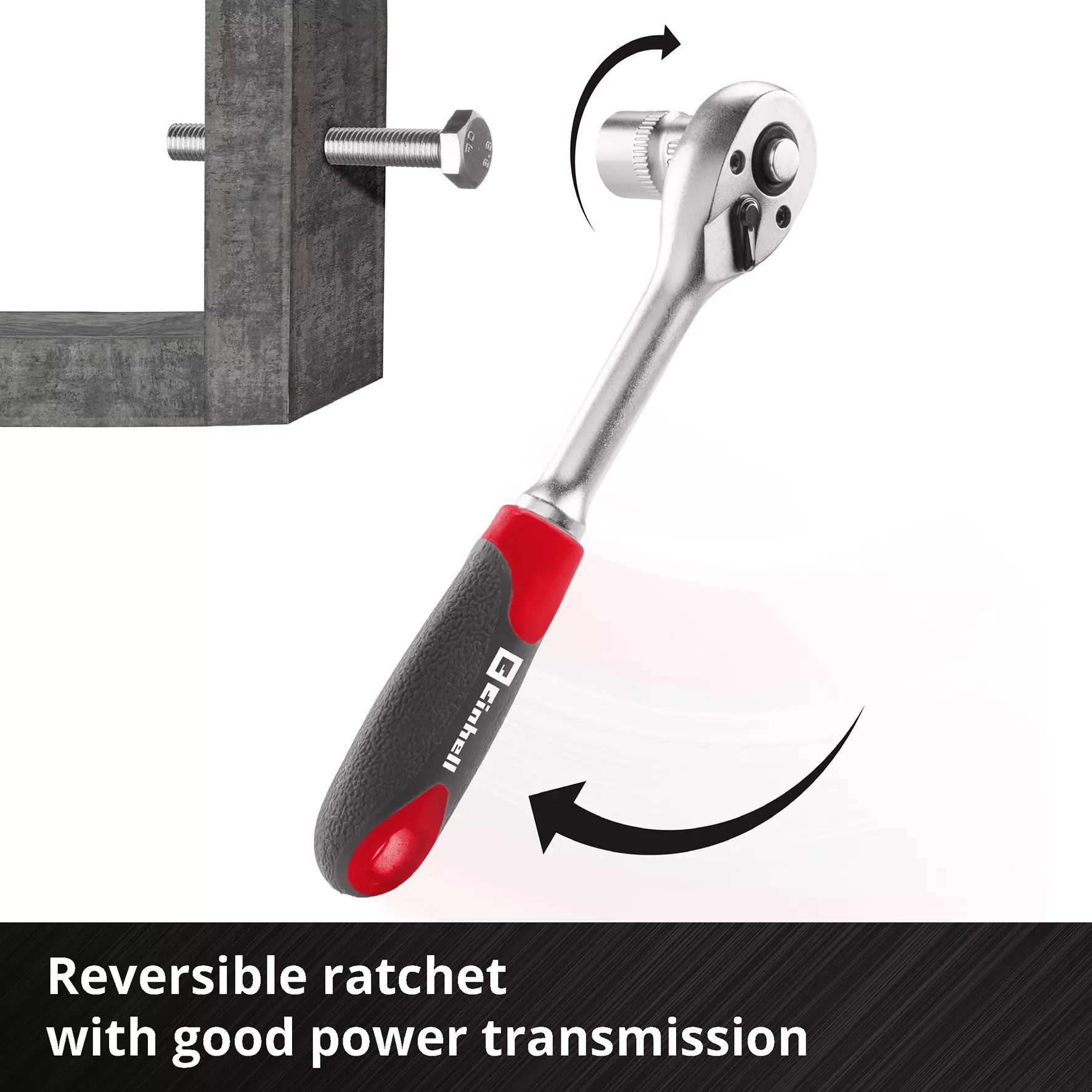 • 1 trinquete reversible con accionamiento de 1/4”, cabeza endurecida y 72 dientes.