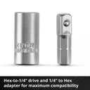 • 2 adaptadores: uno de hexagonal a 1/4” y otro de 1/4” a hexagonal, ambos de acero CV con acabado satinado.