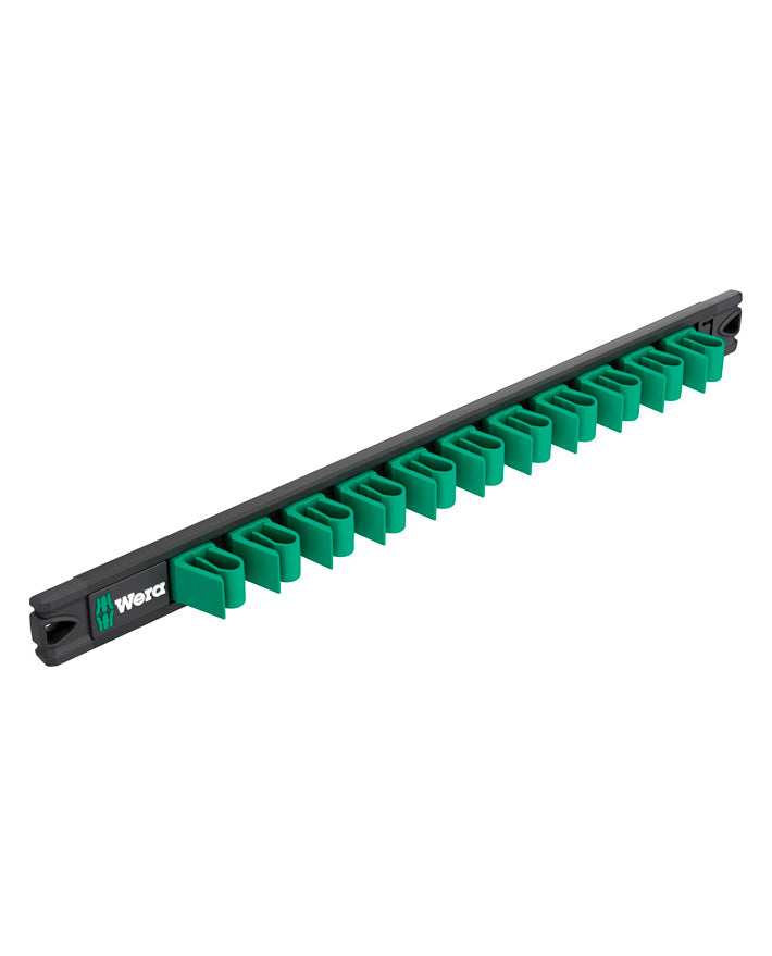 Un listón magnético sin útiles. Para hasta 11 llaves de boca Joker. Los muelles de sujeción que lleva el listón permiten un alojamiento perfecto y una extracción muy fácil de los útiles. Gracias al fuerte imán que lleva, el listón se mantiene de forma segura en superficies metálicas. De forma alternativa, el listón también se puede atornillar en la pared.