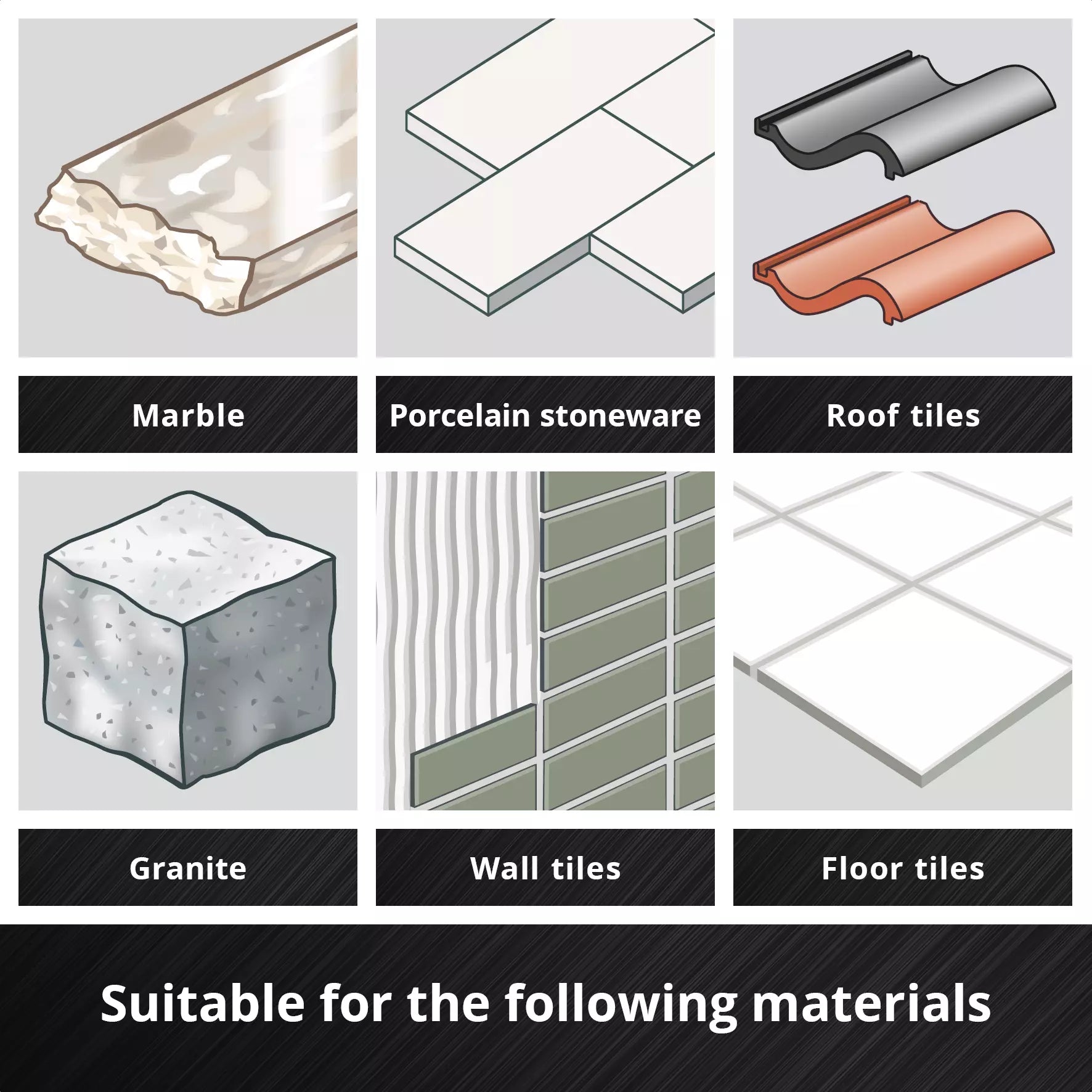 • Diseñadas para perforar materiales como gres porcelánico, mármol, granito, tejas y baldosas de pared y suelo.