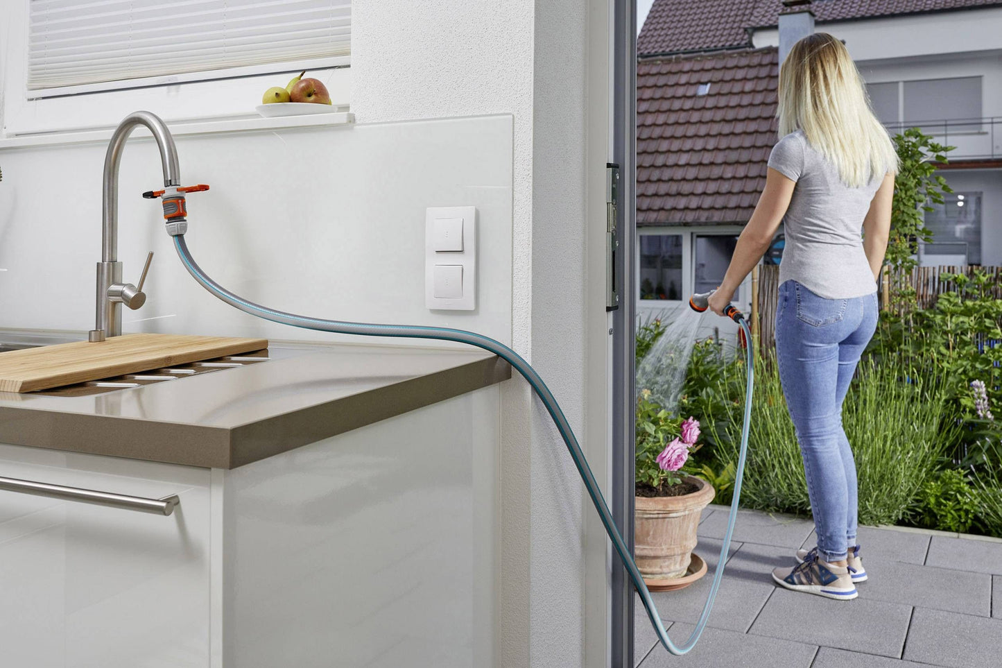Encaixa perfeitamente e é fácil de usar. Com o Adaptador de Torneira Interior GARDENA, é possível ligar o Sistema GARDENA a uma torneira interior, por exemplo, na cozinha ou na casa de banho. Isto é graças à ferramenta de instalação fornecida.