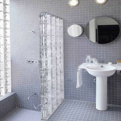 O bloco de extremidade curva da linha de base termina as paredes de blocos de vidro com a elegância típica das gamas de produtos superiores.
