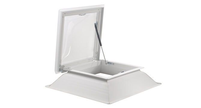 Clarabóia de comando manual com abertura telescópica. Os amortecedores telescópicos facilitam a manobra de abertura, permitindo que a clarabóia seja aberta confortavelmente.