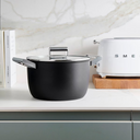 Conjunto de 5 piezas de menaje Smeg ideal para completar la cocina, este conjunto está formado por: Olla de 26 cm con una capacidad de 7,7 l, olla de 24 cm con una capacidad de 4,6 l, cazo de 20 cm con una capacidad de 2,7 l, satén de 28 cm y 24 cm con un acabado negro mate antiadherente están diseñados para todo tipo de preparaciones y recetas, son perfecta en función del estilo y calidad de comida que se está cocinando.