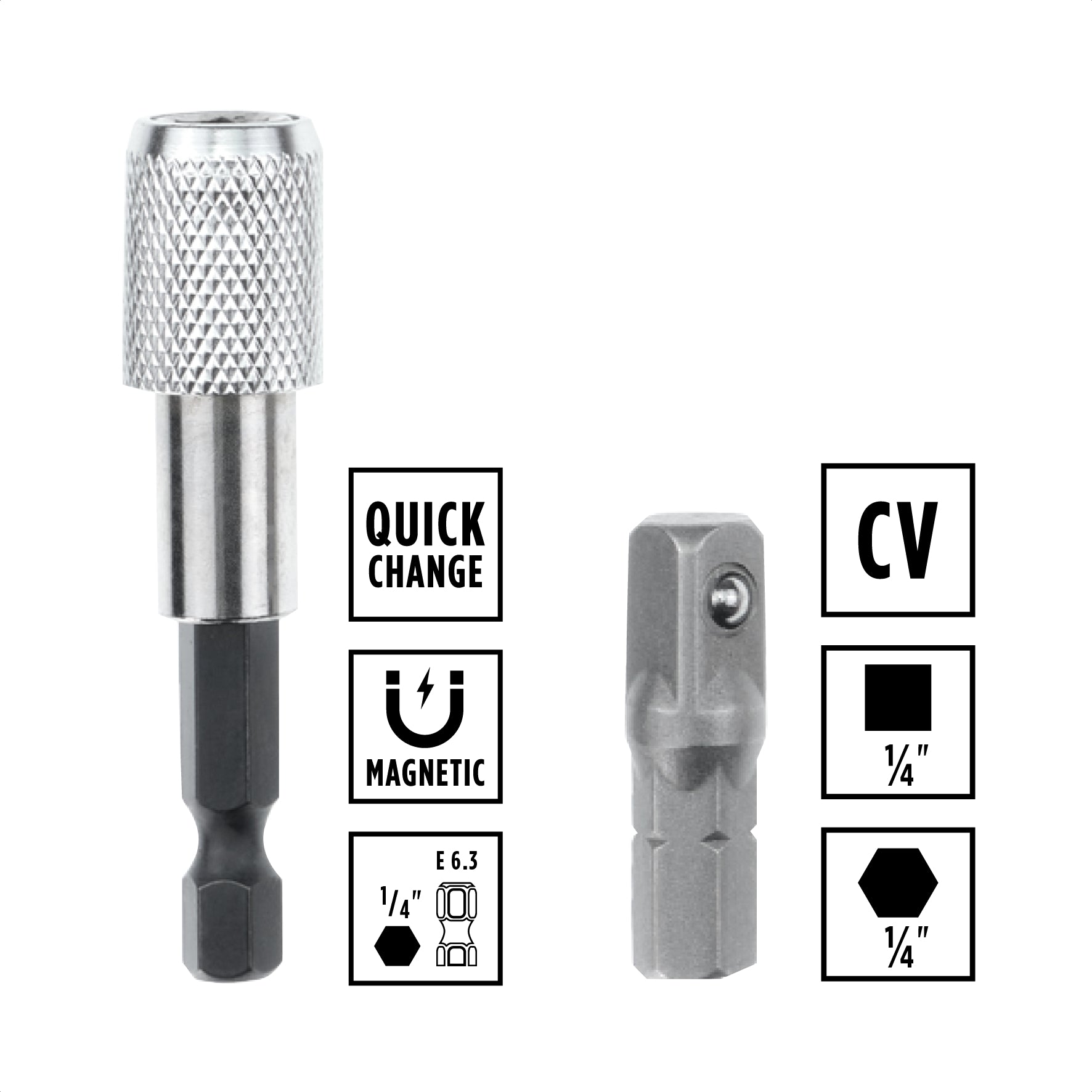 - 1 suporte de pontas de troca rápida de 60 mm com haste E 6.3, fabricado em aço carbono durável, permitindo trocas rápidas e fáceis graças ao seu potente ímã.