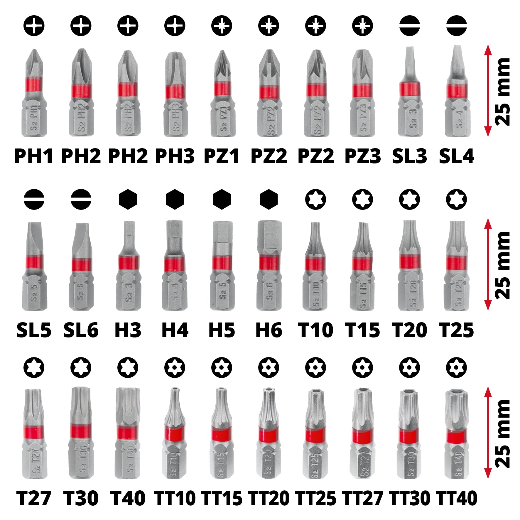 - 30 pontas de 25 mm com haste C 6.3, identificadas com um anel vermelho para facilitar o reconhecimento. As pontas incluídas são: