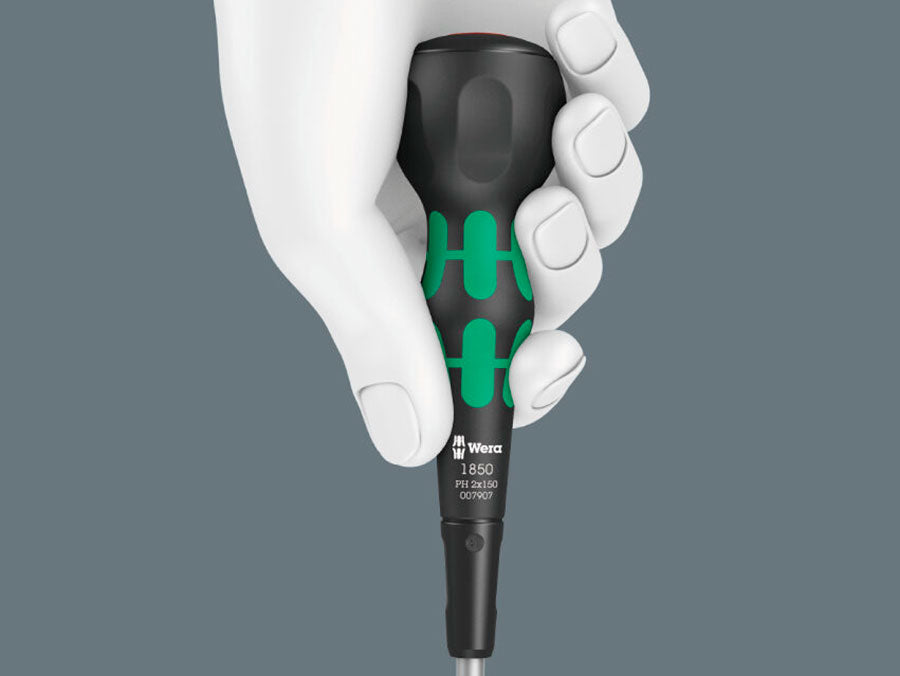 - As ferramentas são Lasertip: a extremidade do veio das chaves de fendas Wera Lasertip foi tratada com raios laser para obter uma rugosidade microscopicamente fina. Esta superfície rugosa agarra-se praticamente à cabeça do parafuso como se tivesse dentes. Isto evita que a ferramenta escorregue involuntariamente do parafuso.