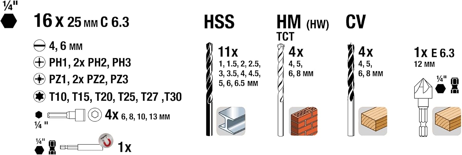 Este conjunto é o complemento perfeito para parafusadeiras a bateria, furadeiras recarregáveis e furadeiras com fio, oferecendo uma solução completa para uma ampla gama de tarefas de perfuração e atarraxamento.