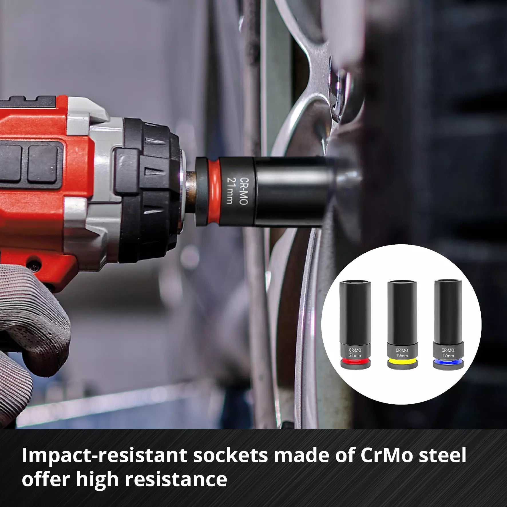 O Jogo de chaves de impacto Einhell de 5 peças (modelo 49109273) é um conjunto concebido para facilitar a troca de rodas em veículos, especialmente em jantes de liga leve sensíveis.