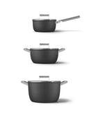 Conjunto de ollas de menaje Smeg ideal para completar la cocina, este conjunto está formado por: Olla de 26 cm con una capacidad de 7,7 l, cazo de 20 cm con una capacidad de 2,7 l, olla de 24 cm con una capacidad de 4,6 l con un acabado negro mate antiadherente están diseñados para todo tipo de preparaciones y recetas, son perfecta en función del estilo y calidad de comida que se está cocinando.