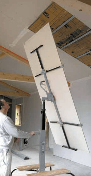 Elevador de placas com posições horizontais e inclinadas no telhado, com uma capacidade máxima de carga de 75 kg e uma altura máxima de instalação de 4,00 metros. Tem 4 rodas com sistema de bloqueio.