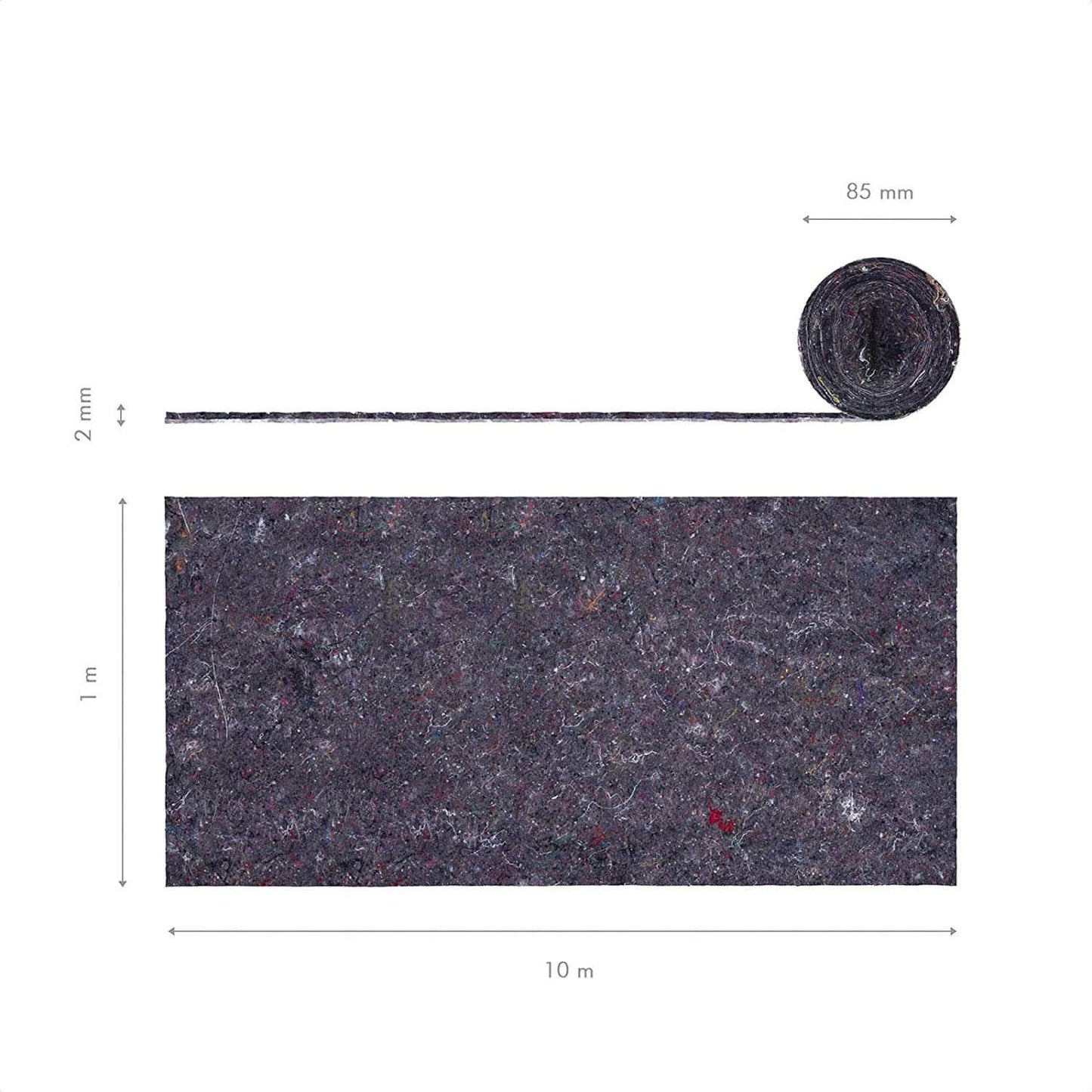 Piso de feltro com 10 metros de comprimento e 1 metro de largura. Corpo de poliéster, algodão e polietileno. Impermeável e reutilizável. Absorventes de tintas e líquidos. Anti-derrapante.