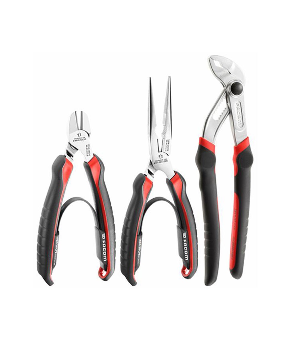Conjunto de alicate de 3 peças CPE.A3 da Facom. Conjunto com alicate de bloqueio multi-nose, alicate de corte diagonal e alicate de pontas semi-redondas.