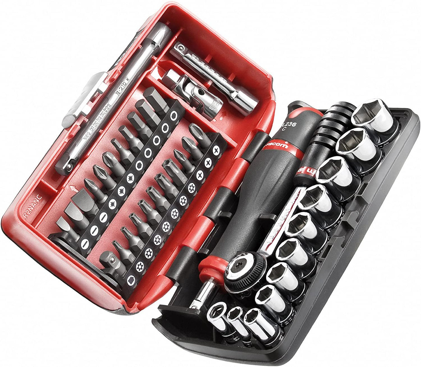 Jogo de Vasos e Pontas com catraca + 38 peças Facom R.181NANO. O conjunto inclui catraca, cabo de chave de fendas, duas extensões, junta universal, tomada de bits, 10 soquetes e 21 bits.