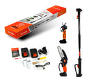 Kit de poda a bateria completo, inclui tesoura de poda a bateria, motosserra elétrica, vara telescópica, duas baterias compatíveis, óculos de proteção, carregador e acessórios de manutenção. Tudo o que você precisa em um único pacote.