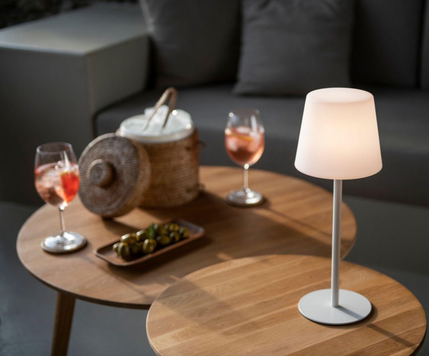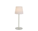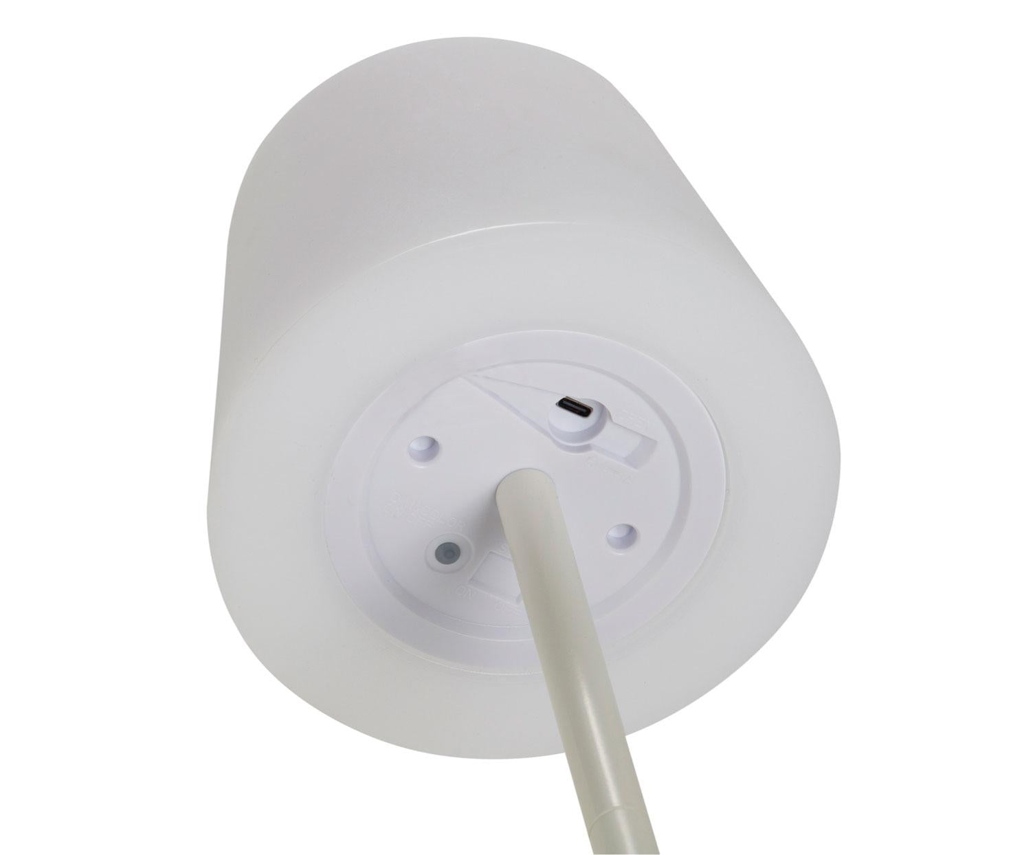 Luminária de mesa LED sem fio de design moderno em branco, com estrutura de metal e plástico que combina funcionalidade e estilo minimalista. Ideal como iluminação auxiliar para dormitórios, salas, escritórios ou espaços em que se deseja luz sem cabos ou tomadas próximas.