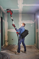 A placa de lixa com mola assegura um contacto óptimo com a parede ou tecto. O disco de lixa tem um micro fecho de gancho e abertura. A pega longa dobrável facilita o transporte da lixadora eléctrica de paredes secas e armazena-a num espaço mínimo, e a extensão de alumínio com pega adicional também pode ser removida.