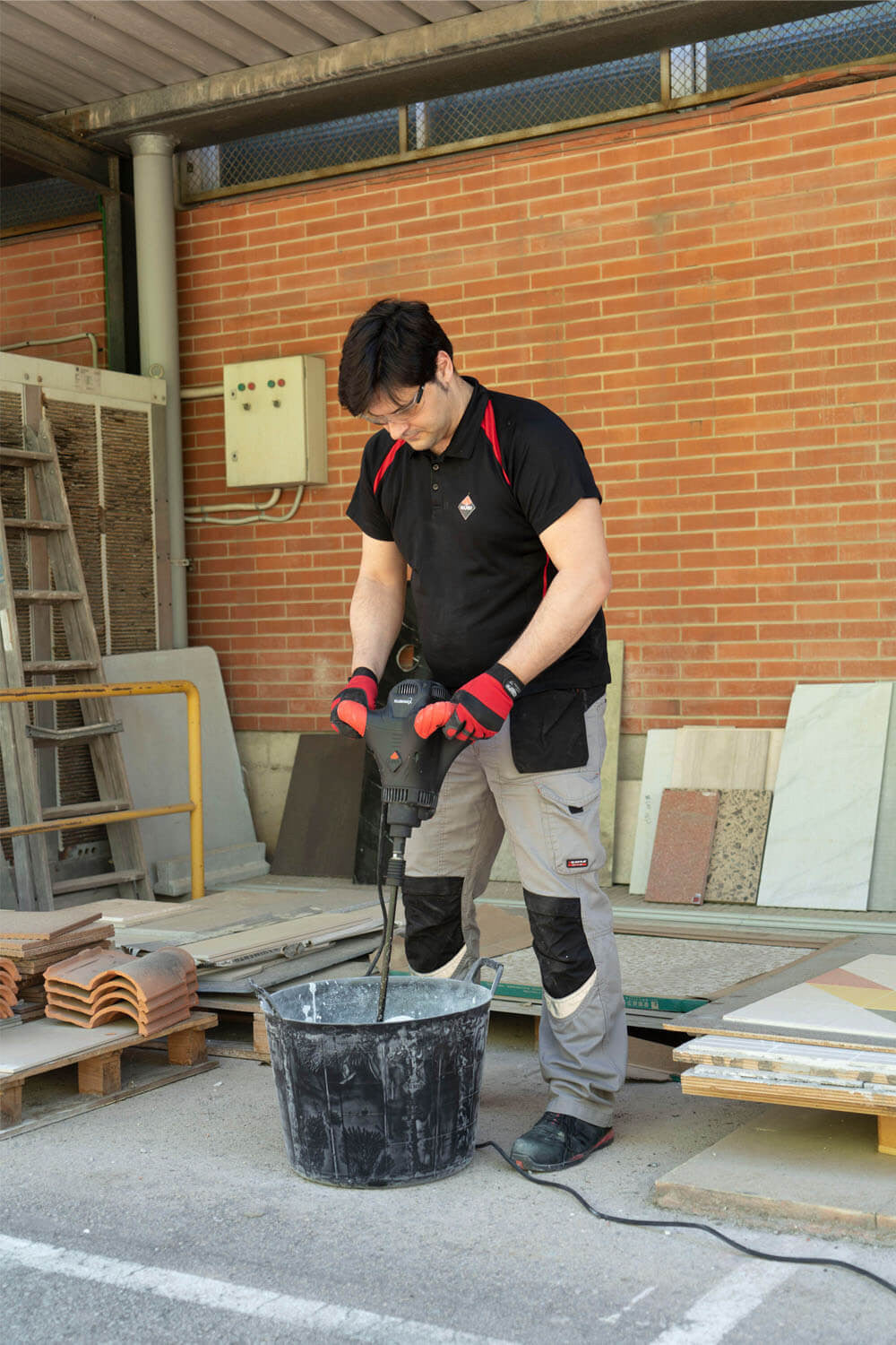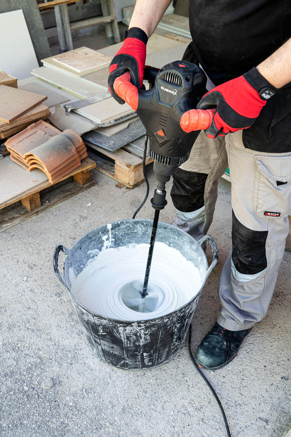 Com a haste misturadora padrão RUBIMIX-9 POWER MAX de 140 mm de diâmetro, 3 eixos, 140 mm de diâmetro, é possível misturar até 40 kg de adesivo cerâmico ou qualquer outro material de base cimentícia. Mas, graças ao seu 2100W, a RUBIMIX-9 POWER MAX pode montar varetas de mistura até 160 mm, o que nos permitirá misturar até 60 kg de material.