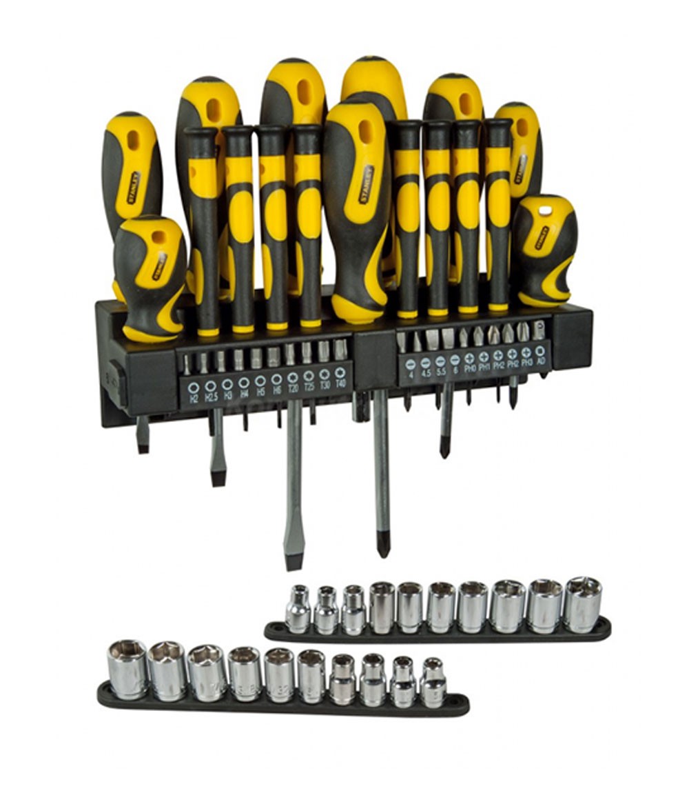 Conjunto de chaves de fendas de 57 peças STHT0-62143 de Stanley. O conjunto inclui chaves de fendas, tomadas e bits. Chaves de fenda com cabo bimaterial. Desenho ergonómico tri-lobo. Lâmina niquelada. Magnetizado e ponta marcada.