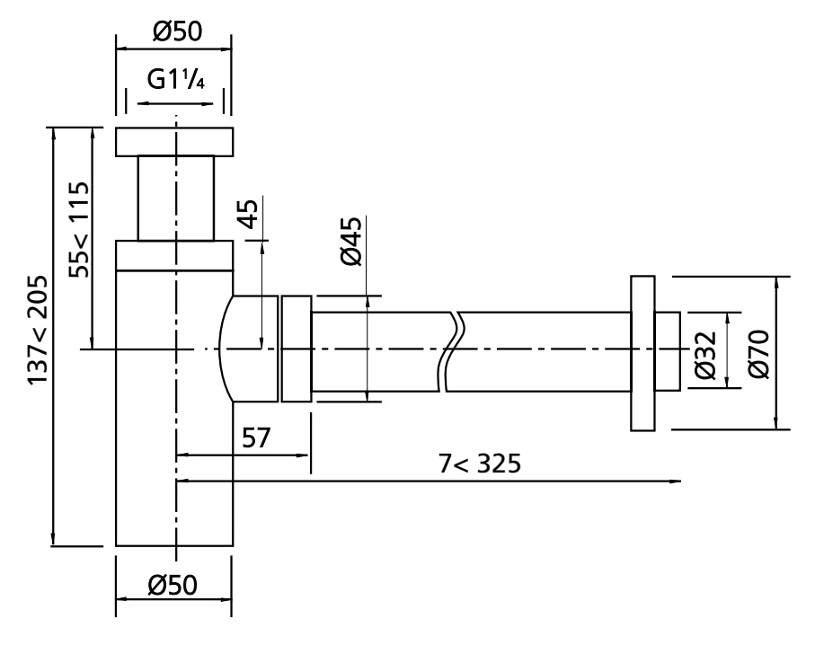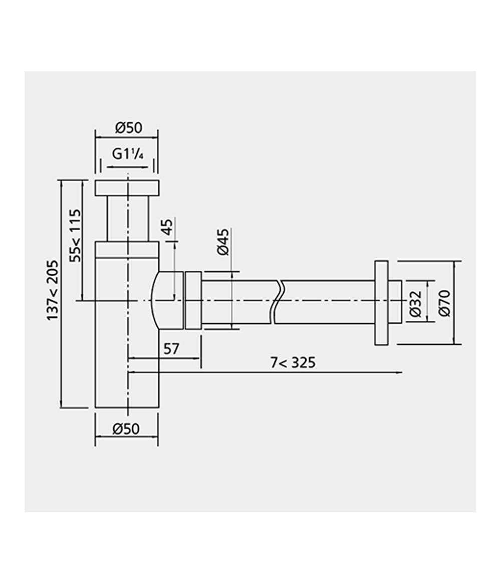 Sifão cromado para lavatório Wirquin. Sifão ajustável de latão cromado. Enseada 1 1/4. Altura de 137 a 205mm. Diâmetro do tubo 32mm e comprimento 325mm.