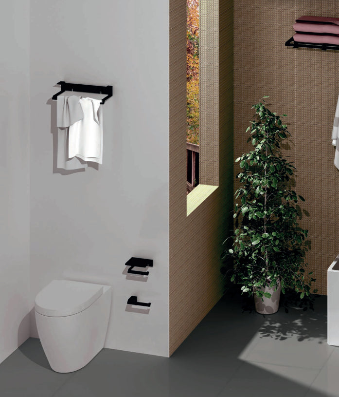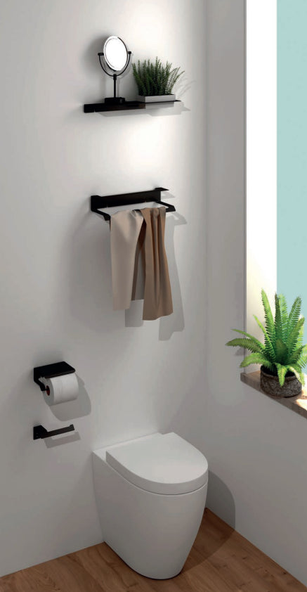 O porta-papel higiênico com tampa da coleção Slim se destaca porque a própria tampa serve como bandeja para colocar celular, lenços umedecidos... Este item pode ser parafusado ou colado na parede com cola MT. Disponível em aço escovado ou preto.