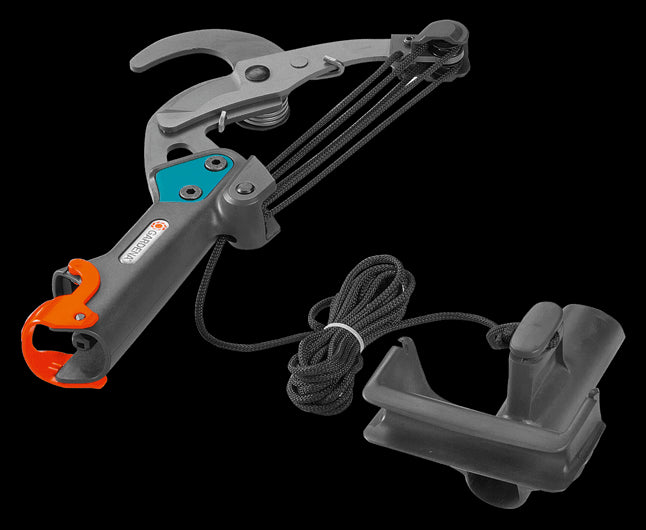 - Graças à aderência em D ajustável, é possível uma operação potente, confortável e ergonómica. O D-grip tem um dedal com fixação da extremidade da corda em ambos os lados.