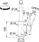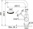 Torneira de cozinha Glenda Swivel Inox, altura total 300 mm, com puxador lateral, arejador lamelar e mecanismo cerâmico. Esta torneira tem uma rotação da cabeça de 180º e uma abertura da manivela de 90º.ESPECIFICAÇÕES